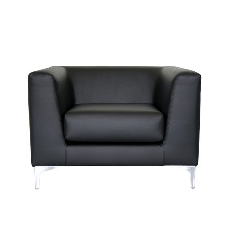 Klub fotelja sa sjedalom i naslonom tapeciranim u eko kožu ili kožu po izboru iz ton karte, s metalnim nožicama.