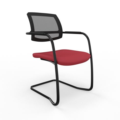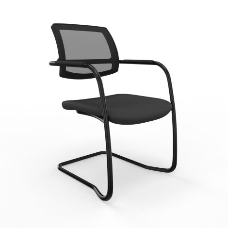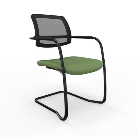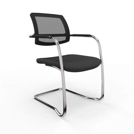 Konferencijska stolica modernog dizajna s sjedalom tapeciranim u tkaninu po izboru te naslonom u crnoj mreži. Postolje stolice kromirana skija; Rukonasloni kromirani.