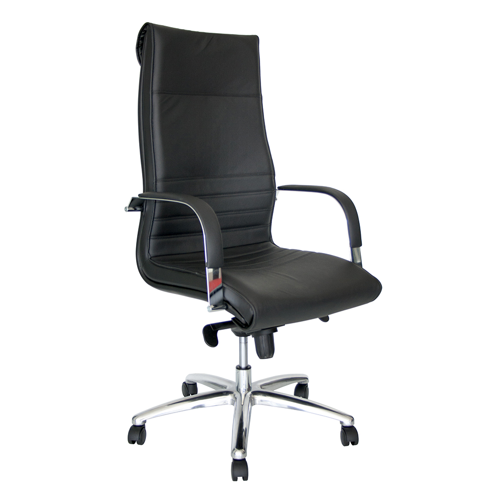 Uredska fotelja visokog naslona, sjedalo i naslon tapecirani u kožu. Rukonasloni fiksni, kromirani, presvučeni poliuretanom u crnoj boji, mekani na dodir. Peterokraka baza aluminijska, promjera 70 cm; kotači za mekane podove.
