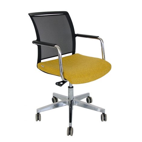 Konferencijska stolica modernog dizajna, okretna, sa sjedalom tapeciranim u tkaninu po izboru te naslonom u crnoj mreži. Postojeća spužva sjedala s dodatnim slojem memorijske pjene od 1 cm debljine. Postolje peterokraka aluminijska baza s gumenim kotačima. Rukonasloni kromirani.