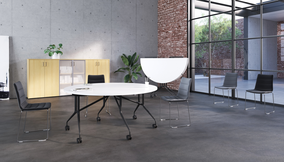 Potkonstrukcija je metalna, u antracit boji. Topovi su dvodjelni, izrađeni od iverala debljine 25 mm. Rubovi kantirani ABS rubnom trakom debljine 2 mm. Okrugli konferencijski stol Clip se preklapa na širinu od 40 cm pri čemu mehanički sistem omogućuje jednostavno preklapanje, a kotači na potkonstrukciji omogućuju i lagano pomicanje. Opremljen je posebnim antishok sistemom te je stoga pouzdan i siguran za uporabu, bez mogućnosti ozljede.